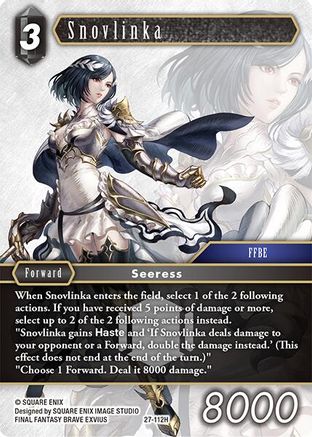 "Snovlinka gains Haste and ‘If Snovlinka deals damage to your opponent or a Forward, double the damage instead.’ (This effect does not end at the end of the turn.)"